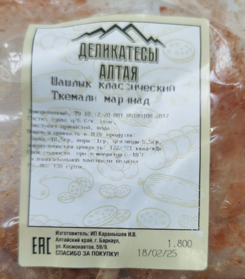 Шашлык куриный без кости на коже в маринаде ткемали 1,8 кг
